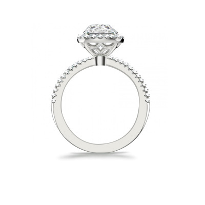 The Trinity engagement ring has a dramatic triple split shank pave band that tapers in towards an equally show-stopping center stone surrounded by a glistening diamond halo. This unique style is supported by a decorative gallery, making the Trinity ring equally breathtaking from any angle.